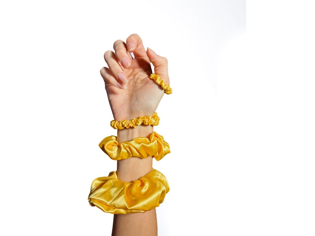 - Saténové scrunchies vypadají podobně, ale jsou vyrobené z umělých materiálů (acetát, polyester). Jsou cenově dostupnější, ale zato méně šetrné k vlasům.